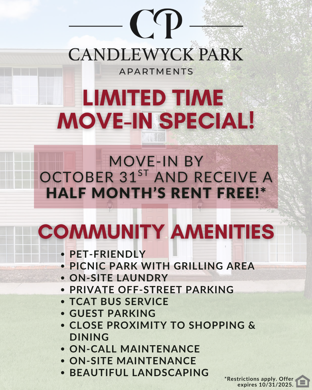 Move-In By October 31st and Receive A Half Month's Rent Free! *Restrictions Apply.